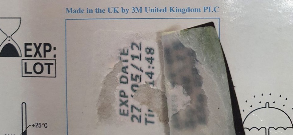 A box of masks showing the original expiry date